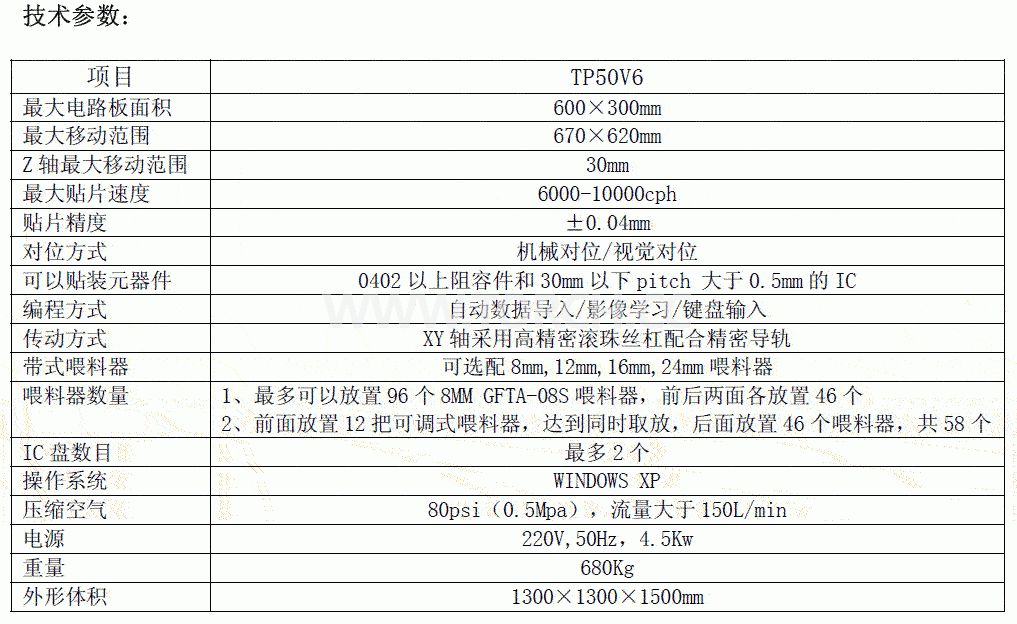 高速貼片機TP50V6是一款全自動視覺貼片機,它通過真空吸嘴可以貼裝各種元件,是目前市場上性價比高的全自動貼片設備。本產品適合大部份SMD 片狀元件0402, SOIC, PLCC 及QFPIC;配置視覺對中系統,滿足高精密度0.5mm 腳距之QFP IC 或BGA 等芯片的貼裝.除標準的圓形基準點外,不絲印焊錫膏的方形的PCB 焊盤和環型穿孔焊盤,也可作為基準點來識。