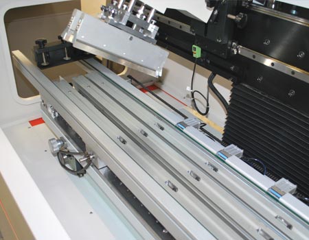 SP400 絲印機是一款在線式高精度的LED 錫膏印刷機,適合用于LED 燈條的批量化生產使用,PCB 板通過傳輸系統被固定在設計巧妙而靈活的工作平臺上,該平臺適用于所有單面和雙面電路板(選配夾具),PCB 板位置的調整、工作平臺的移動、刮刀的升降,都是經由精密導軌導向運動,并且配合變頻馬達的傳動。可確保非常準確的運動精度以及高的重復精度。